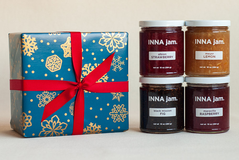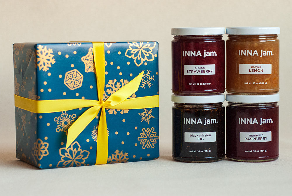 This gift includes four jars of INNA jam (or pickle) packaged in a gift box, wrapped in our "SNOWFLAKES" gift wrap, and finished with a yellow or silver ribbon.